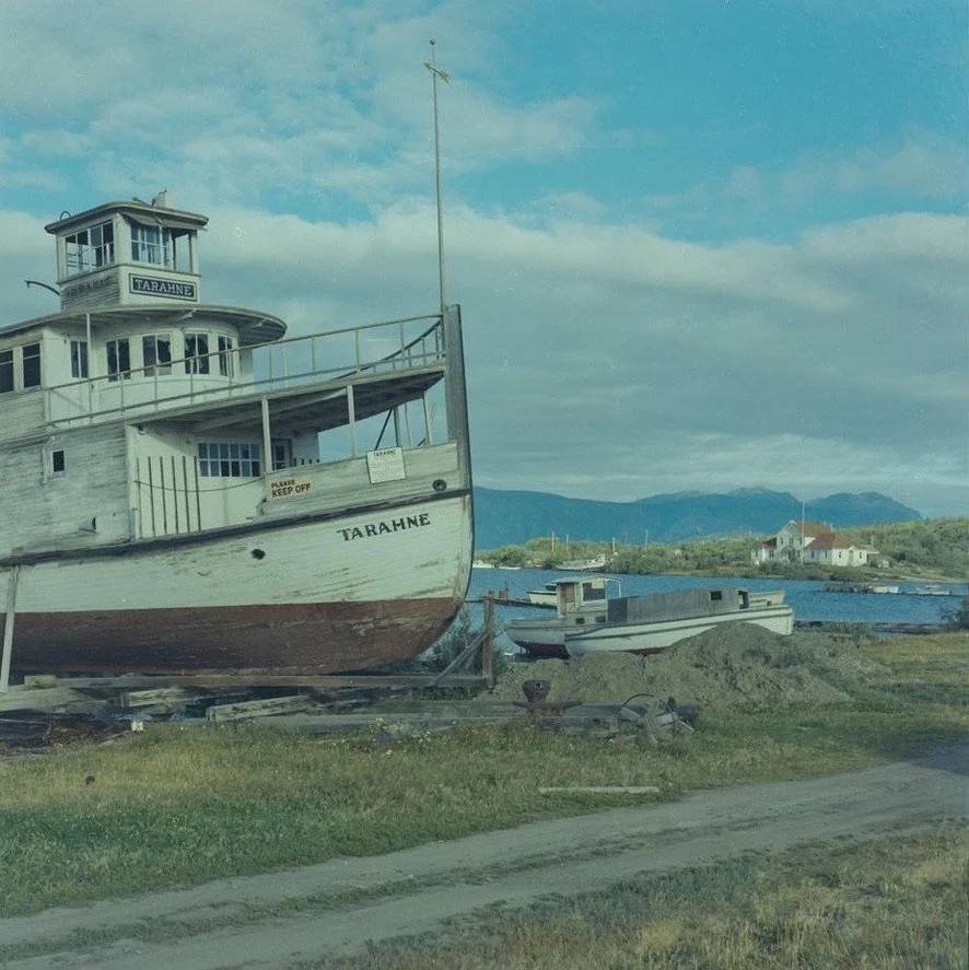 Brad Smith and Carolyn Moore tracked down photos of the Mystery Boat in the 70's. It must have been important; it's beached right between the Tarahne and the Atlinto. Notice the identifying shape of the gunwale at the stern.